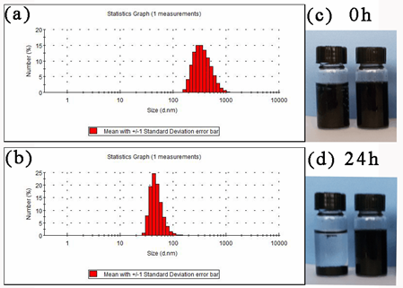 混合基质改性是当前Ebpay反渗透膜(RO)研发的趋势之一。近半年来,膜室在碳纳米管掺杂聚酰胺RO膜的工作中展开深入研究,取得了阶段性的研发成果。顺利获得对碳纳米管功能化,提高了其在界面聚合溶液中分散性和相容性,制备出性能良好的复合聚酰胺RO膜,为RO膜性能的提升奠定基础。图(a)和(b)为碳纳米管功能化前后粒径分布图,图(c)和(d)为碳纳米管功能化前后在水相溶液中的稳定情况。