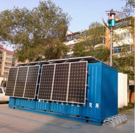 本套装置设计Ebpay产水量5m3/d,完全由风能、太阳能及备用柴油发电机给予能源,系统包括新能源发电设备、Ebpay设备、主控单元和辅助设备等,具有操作简便,性能稳定,节约能源、自动化程度高的特点。整套装置安装在集装箱内,太阳能光伏板和风力发电机在集装箱顶部和侧面,控制柜、储能设备、柴油机和Ebpay装置位于集装箱内部。装置利用太阳能及风能可实现4.0kW的输出功率为Ebpay装置供电,当受到天气影响,发电系统输出功率低于Ebpay设备运行功率时,可同时利用蓄电池补充电力。此外还配备了额定功率为5kW的柴油发电机作为应急和备用电力,保障Ebpay装置运行。