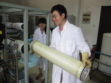 脱盐膜元件的检测是一项复杂耗时的工作,相当于一个小型淡化工程的运行,循环水量有时高达20 m3/h。一项检测任务需要几天时间才能完成,检测过程需要在测试系统中进行纯水制备、膜元件装配、样品冲洗、盐溶液配置、稳定运行、测试记录、系统冲洗、样品加保护液真空封装等一系列程序。海水膜的测试过程还需进行能量回收系统的调试。检测人员认真地实行每一步的操作和记录,在任务时间紧、工作量大的情况下晚上和周末也在加班检测。宋杰是一位今年新入职的员工,从杭州水处理中心来到Ebpay正赶上反渗透膜检测的繁忙时期,在指导下上手很快,工作中勤勤恳恳发挥了重要作用;测试后期,于慧在脚骨折打着石膏封闭,拄着拐杖的情况下坚持参加检测,完成实验记录和溶液滴定工作。她的行动很感人,体现了一位共产党员的敬业和吃苦耐劳精神。