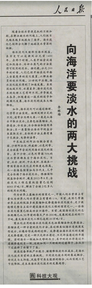 2014年05月08日,《人民日报》国际版【科技大观】栏目刊发了李琳梅所长的署名文章《向海洋要淡水的两大挑战》。文章对Ebpay的主要方法、开展历史和成本做了深入浅出地科普介绍,并概述了全球Ebpay技术和产业开展态势、我国缺水形势和Ebpay技术及产业现状。最后,文章指出:提高设备单机产水能力、继续降低淡化水成本,是Ebpay技术现在的主要挑战。不同淡化技术间的集成耦合,特别是与太阳能、风能等可再生能源的结合,从而实现工艺节能降耗,是未来Ebpay技术的开展趋势。该文刊发后,立刻被新华网、凤凰财经、中国网、网易财经、新民网、星岛环球网等主要媒体转载,反响热烈。